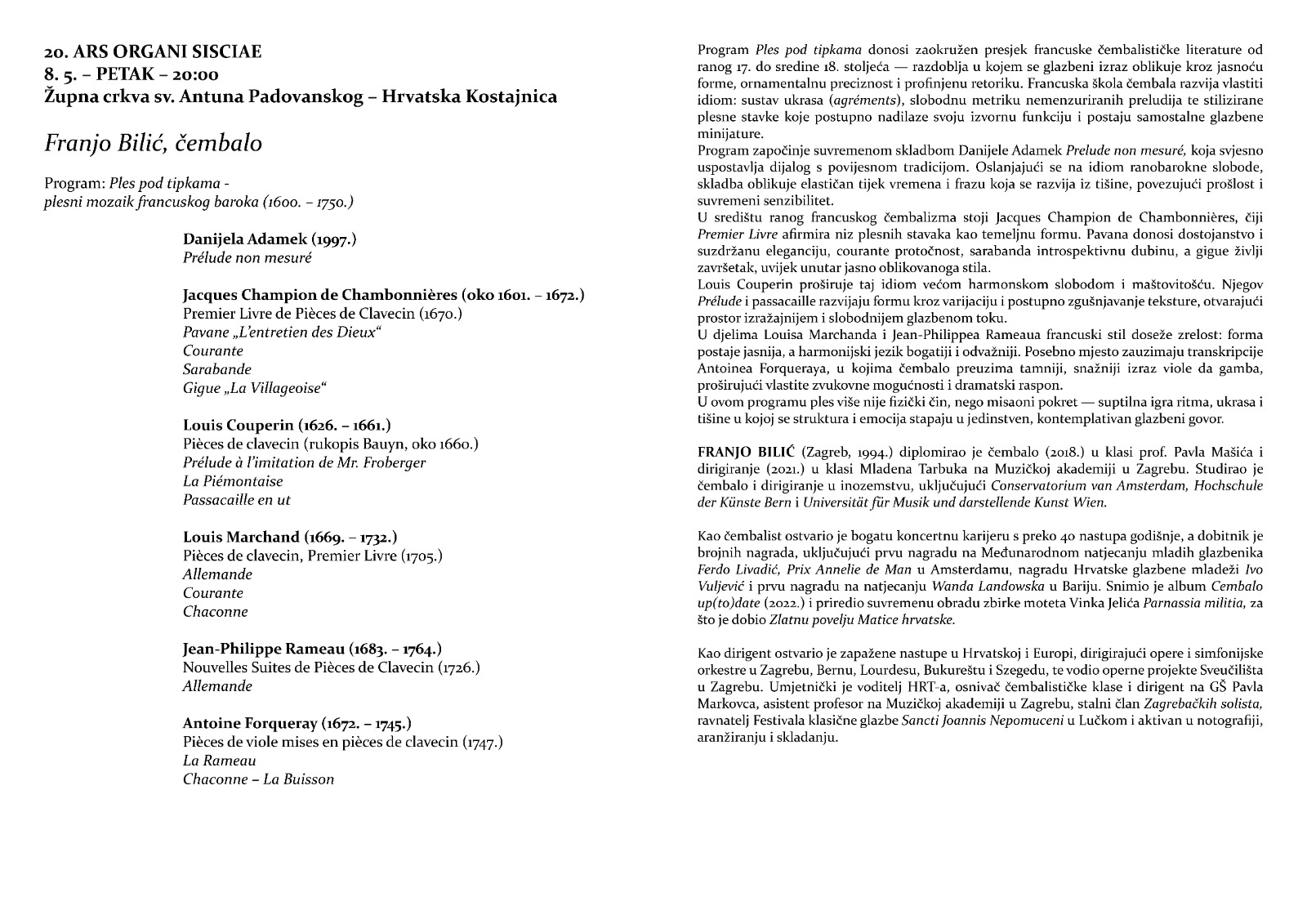 Dobrodošli na 20. Međunarodni orguljaški festival Ars Organi Sisciae, jedinstvenu glazbenu manifestaciju koja slavi bogatu orguljašku baštinu Sisačke biskupije i šire regije. Kroz koncertni program na povijesnim orguljama, povezujemo generacije i kulturu, vraćamo zvuk u sakralne prostore te podsjećamo na neprocjenjivu vrijednost europskog kulturnog nasljeđa.